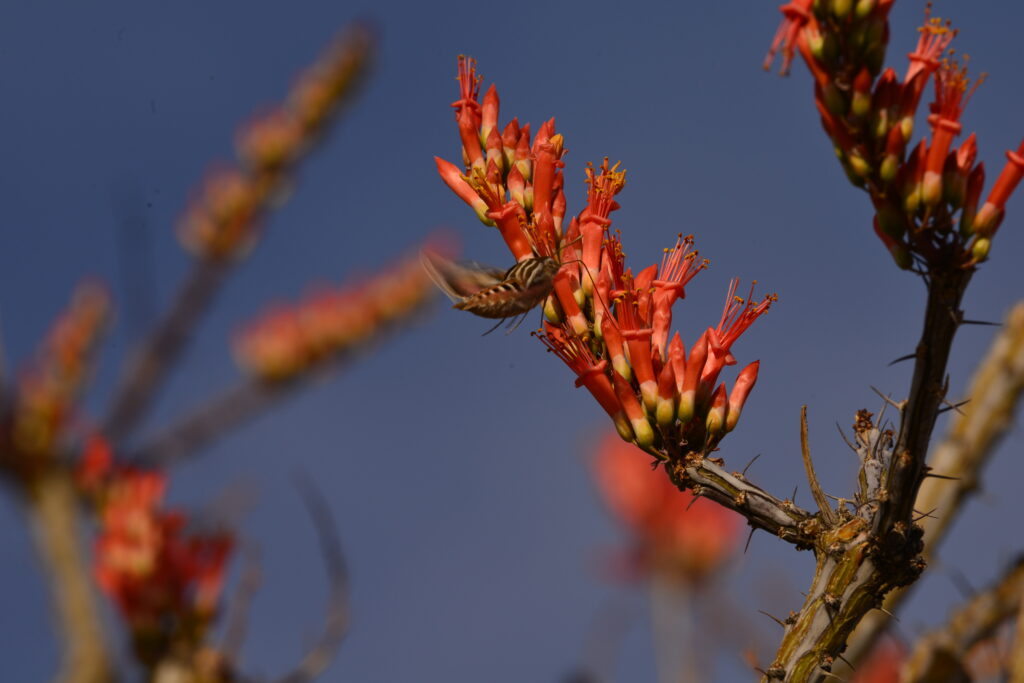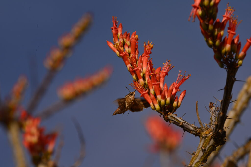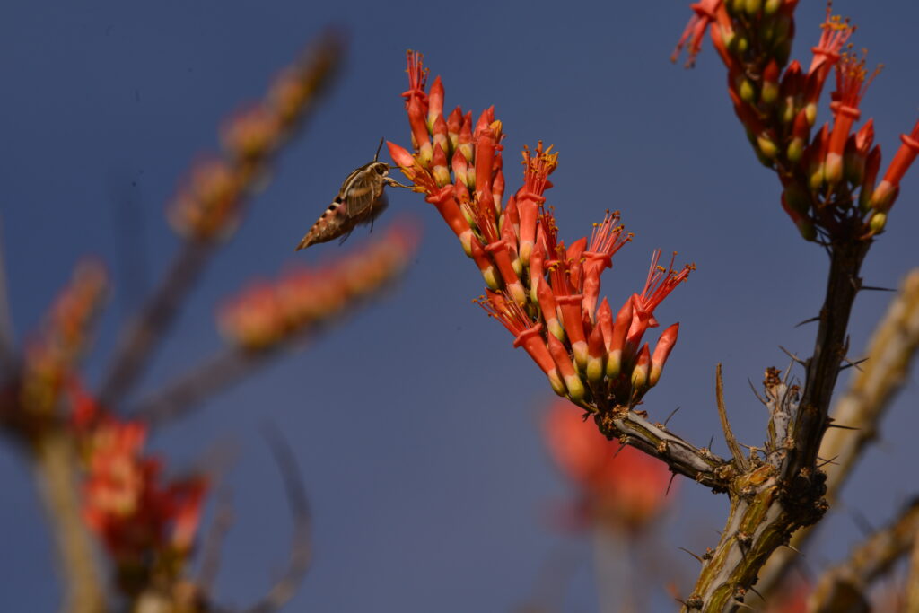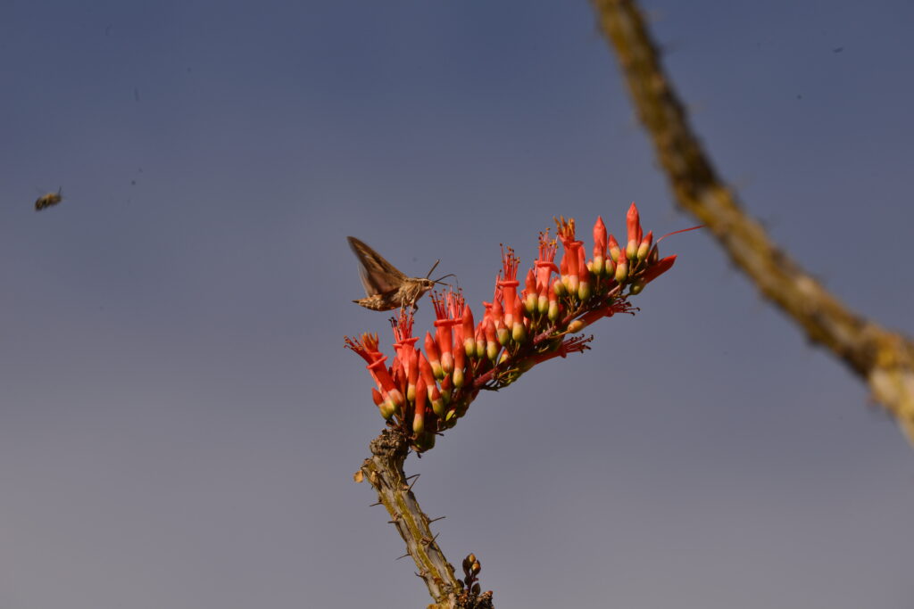 ‘TIGER STRIPED ELEPHANT NOSE HUMMINGBIRD MOTH’ ON AN OCOTILLO BLOOM
